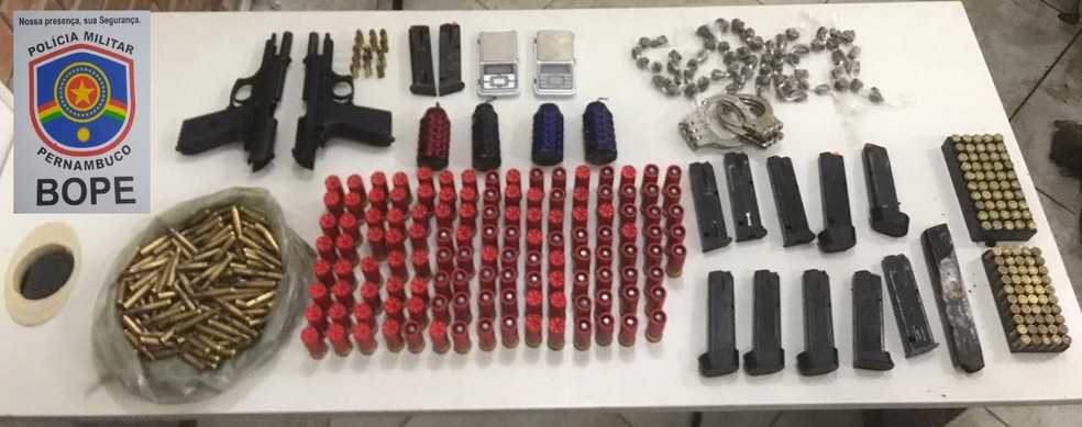 Um homem foi preso em flagrante por suspeita de liderar uma quadrilha de tráfico que atuava em Salinas, em Porto de Galinhas, no município de Ipojuca, no Grande Recife. Com ele, a Polícia Militar encontrou balas de fuzil, pistolas e espingarda, quatro granadas caseiras, além de armas e drogas. De acordo com a Polícia Militar (PM), agentes do Batalhão de Operações Especiais (Bope) receberam a denúncia de que o suspeito de liderar a quadrilha que atuava em Porto de Galinhas e comunidades vizinhas estaria escondido no mangue, na comunidade de Salinas. Ao chegar ao local, a PM não localizou o homem, mas recebeu uma nova informação de onde ficava a casa dele. Os policiais, então, se dirigiram até a residência e encontraram o suspeito. Vídeos divulgados pela PM mostraram o Bope em ação na área.